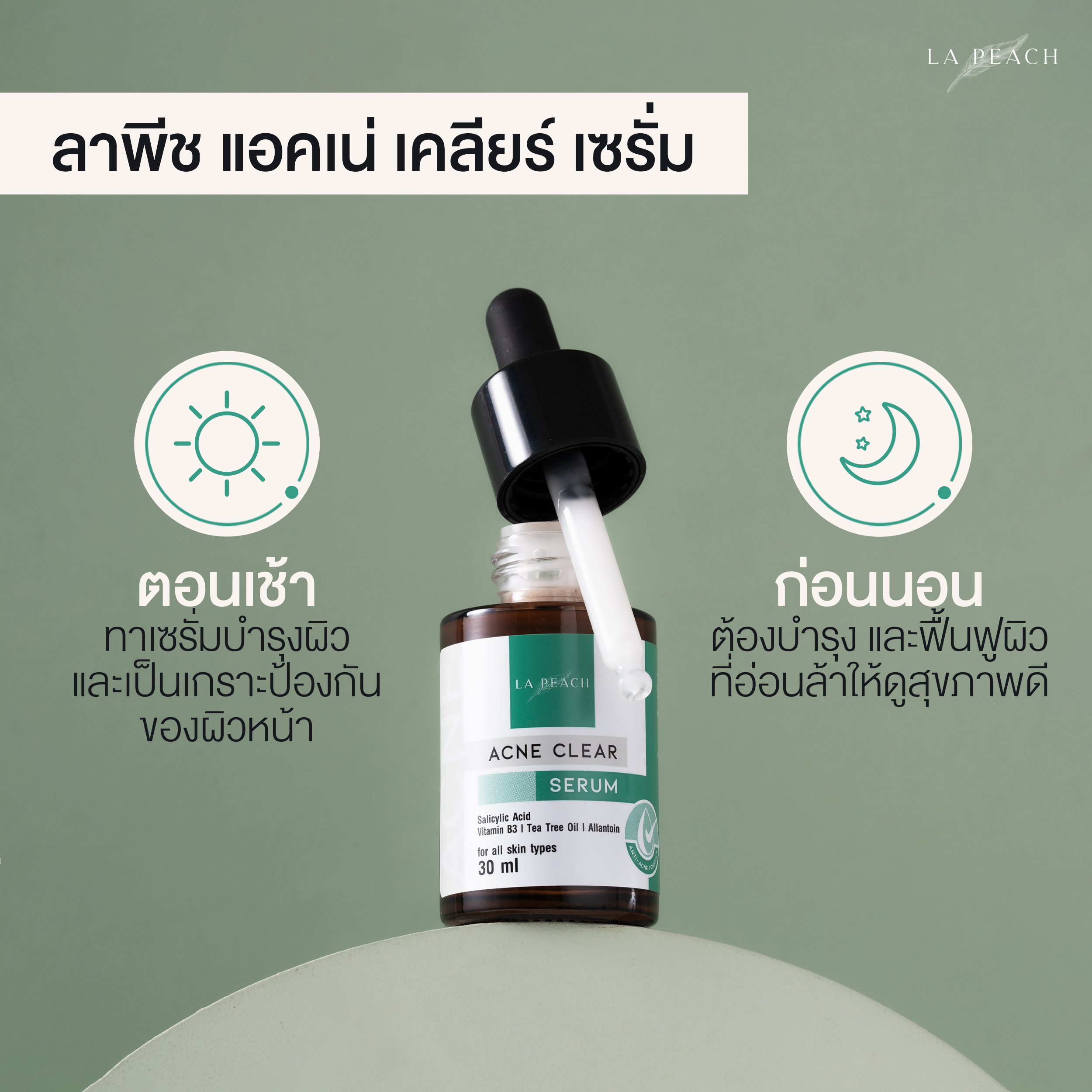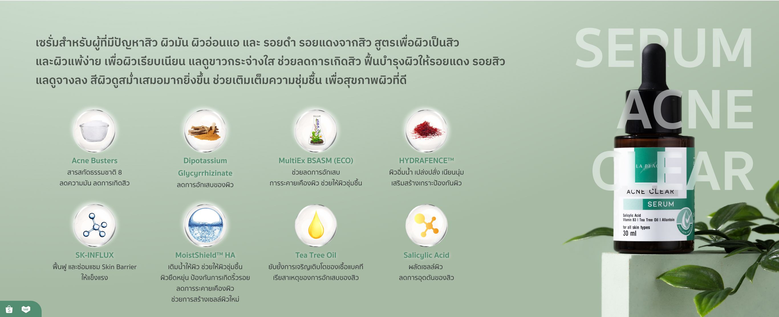 เซรั่มสำหรับผู้ที่มีปัญหาสิว ผิวมัน ผิวอ่อนแอ และ รอยดำ รอยแดงจากสิว สูตรเพื่อผิวเป็นสิวและผิวแพ้ง่าย เพื่อผิวเรียบเนียน แลดูขาวกระจ่างใส ช่วยลดการเกิดสิว ฟื้นบำรุงผิวให้รอยแดง รอยสิว แลดูจางลง สีผิวดูสม่ำเสมอมากยิ่งขึ้น ช่วยเติมเต็มความชุ่มชื้น เพื่อสุขภาพผิวที่ดี