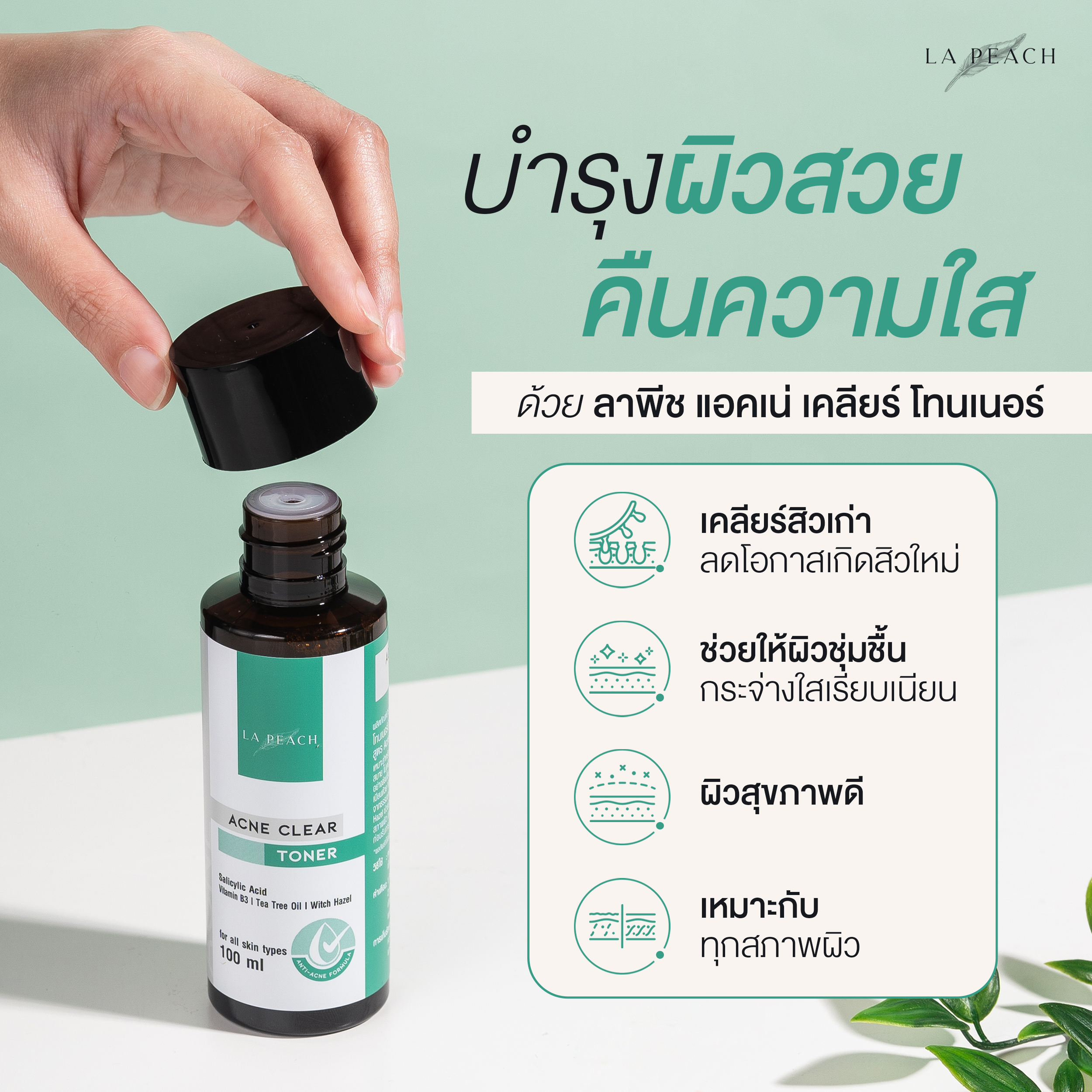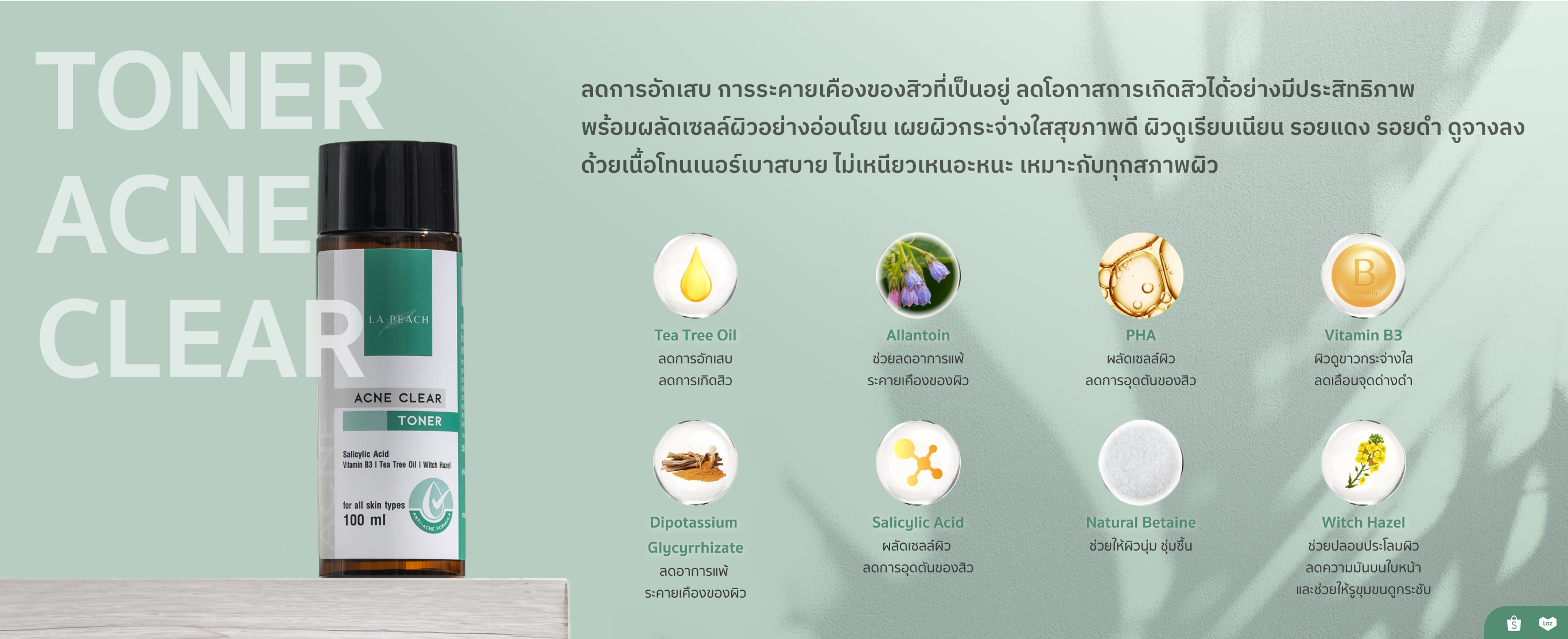 | สรรพคุณ | แก้ปัญหาสิวอย่างตรงจุด ช่วยปลอบประโลมผิว ลดการอักเสบ การระคายเคืองของสิวที่เป็นอยู่ ลดโอกาสการเกิดสิวได้อย่างมีประสิทธิภาพ พร้อมผลัดเซลล์ผิวอย่างอ่อนโยน เผยผิวกระจ่างใสสุขภาพดี ผิวดูเรียบเนียน รอยแดง รอยดำ ดูจางลง ด้วยเนื้อโทนเนอร์เบาสบาย ไม่เหนียวเหนอะหนะ |